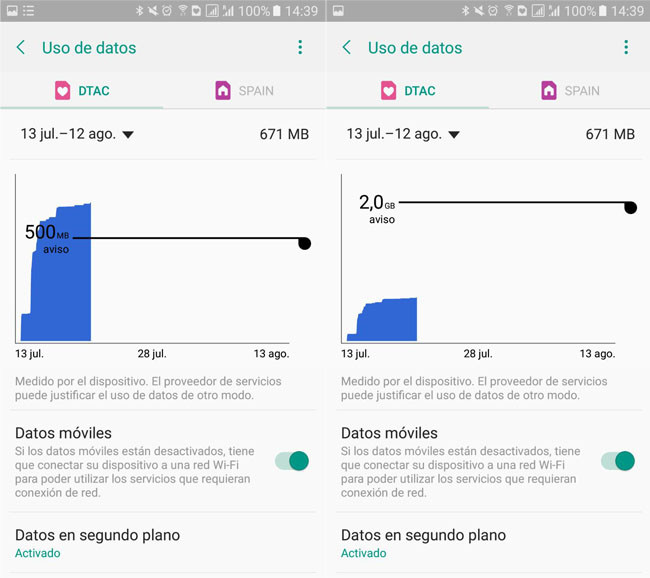 Una vez has cambiado el ciclo es el momento de establecer el aviso de uso de datos. Cuando llegues a esta cifra, el sistema te mostrará un aviso, aunque podrás seguir usando Internet de todos modos.