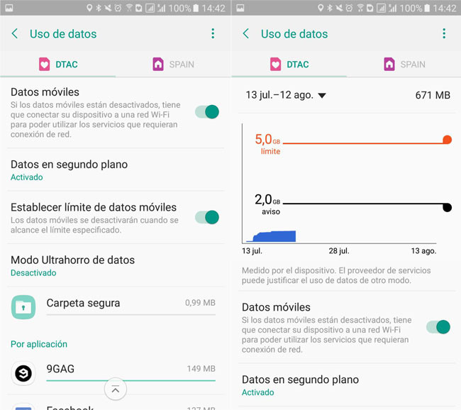 El modus operandi es el mismo: desliza la barra hacia arriba o hacia abajo para establecer un límite para el uso de datos dentro del ciclo que has establecido. En este caso, la conexión mediante datos se cortará al llegar a cierto límite.