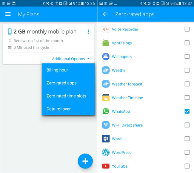 En estos casos, lo más exacto es usar la aplicación oficial de tu operadora, si la hubiera. Si no, necesitarás una aplicación avanzada como My Data Manager. Una vez has configurado tu plan, puedes ir a los ajustes y añadir "zero rated apps" (aplicaciones que no cuentan para tu tarifa) o "zero-rated time slots", franjas horarias donde no se cuenta tu consumo.